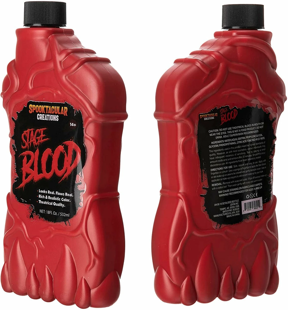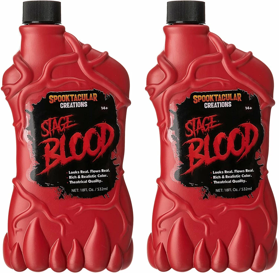 - Including 2 Bottles 18 oz. Fake Blood Bottle. Our fake blood features an incredibly vibrant blood red color that looks and flows like the real thing.