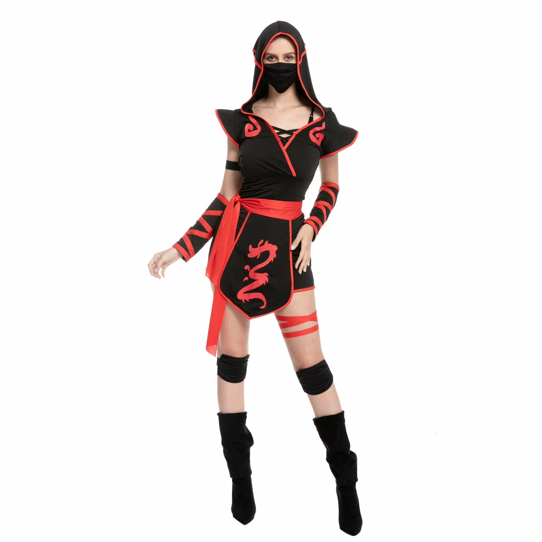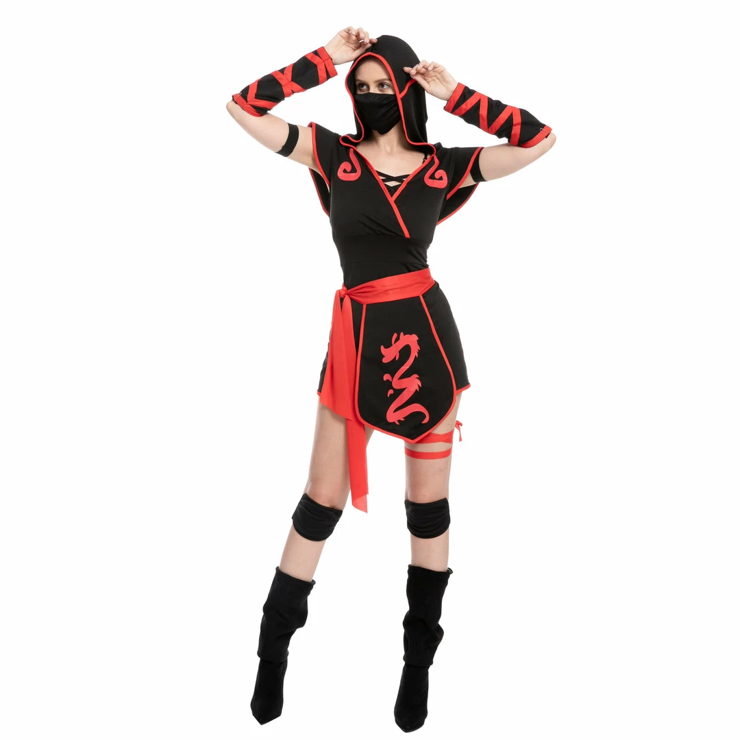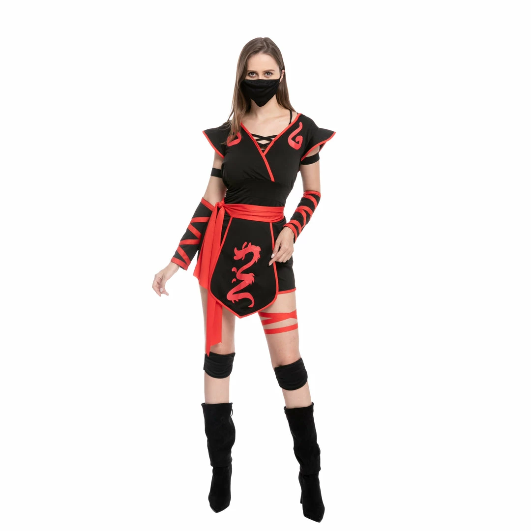 - Includes a V neck and sleeveless styled with a dragon print designed costume, a Ninja Mask, Waist Sash, hood, arm warmers, knee pads, boots, and more.