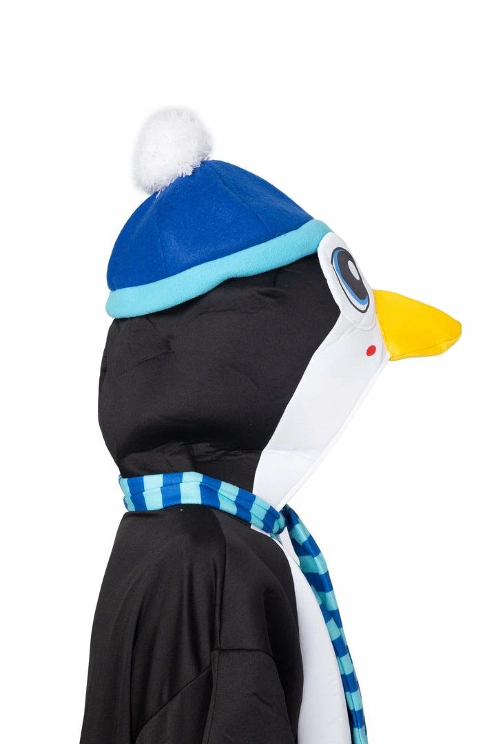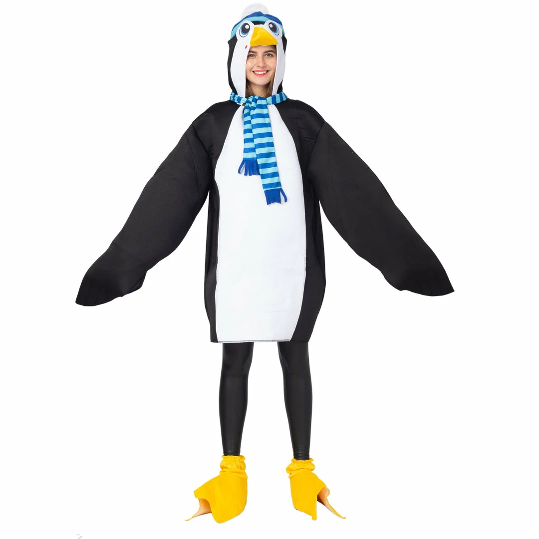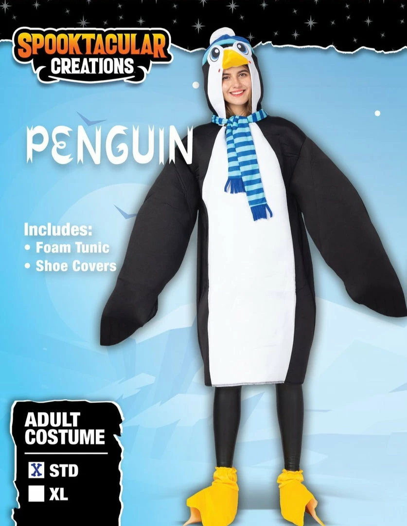 - Penguin Halloween Costume for Teens and Adults Includes Foam Tunic Penguin Suit with Attached Beanie, Scarf, and Boot Covers.