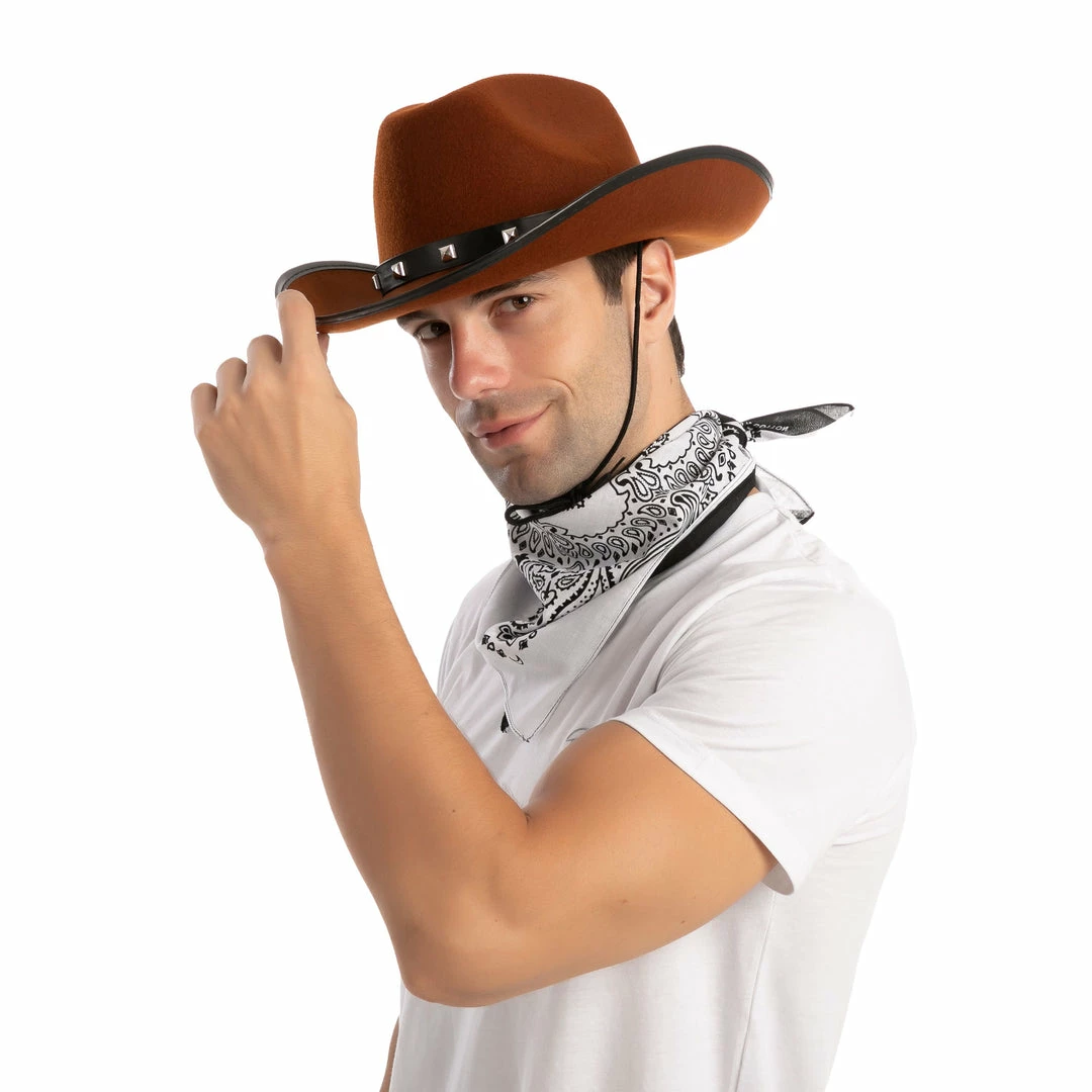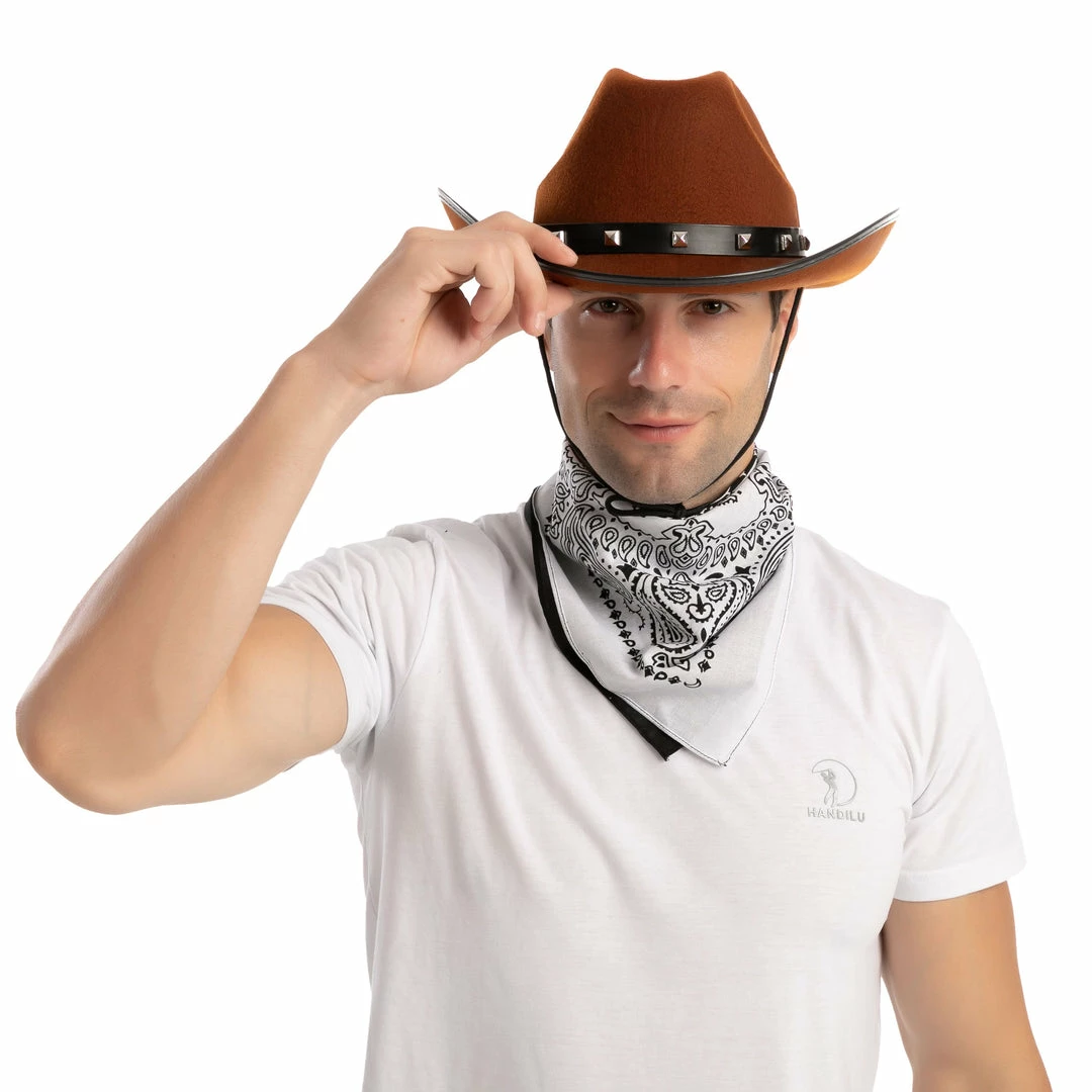 • Cowboy costume includes a brown hat that comes with 3 colors of bandanas, red, white and half black with half white. Unique patterns. Premium quality.