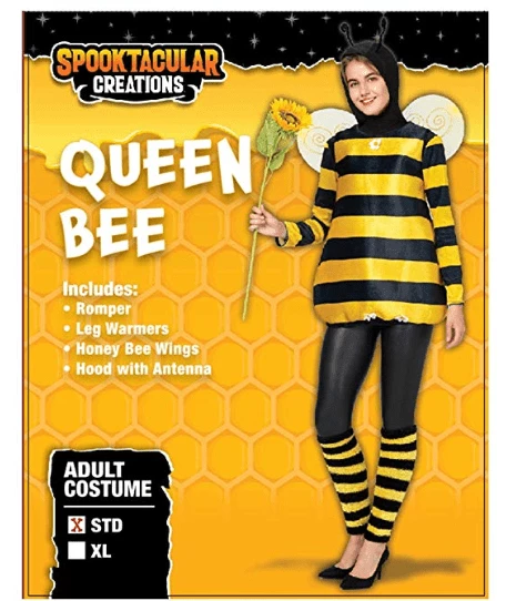 - Queen Honey Bee Animal Costume includes bee romper, honey bee wings, black hood with antenna and bee leg warmers. flower and black tights not included.