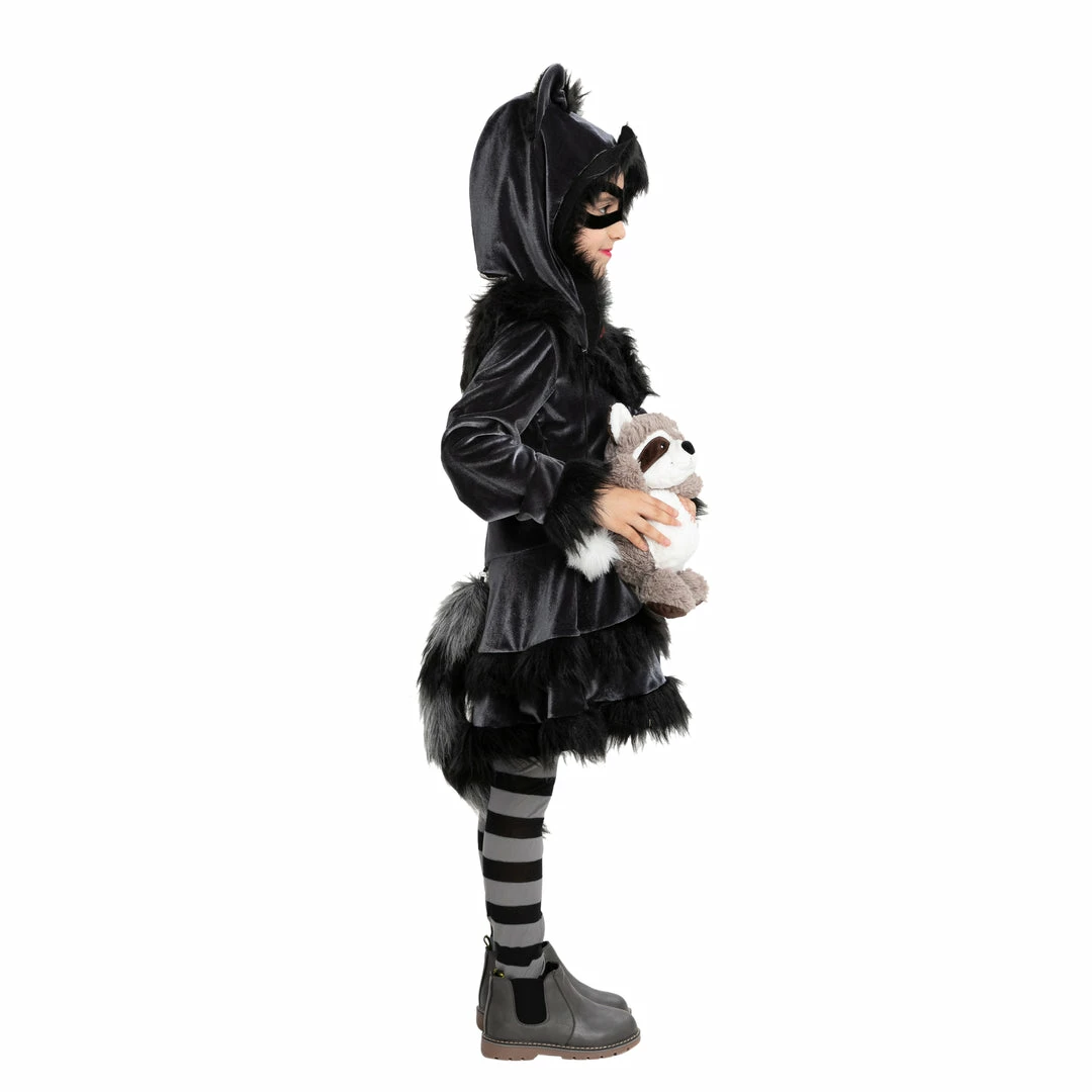 - Girls Raccoon Costume Set includes Dress w/ Plush Tail, Eye Mask, Striped Stockings, and Hood with Ears.