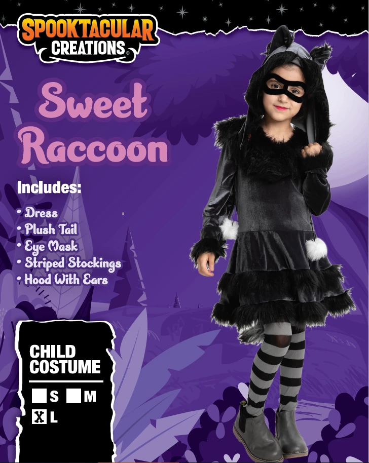 - Raccoon Halloween Costume. Dress up your little girl with this cute Raccoon Costume Set! A unique costume idea for this year’s Halloween party! This is Super Durable with Superior Quality.