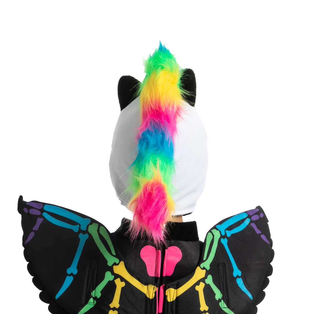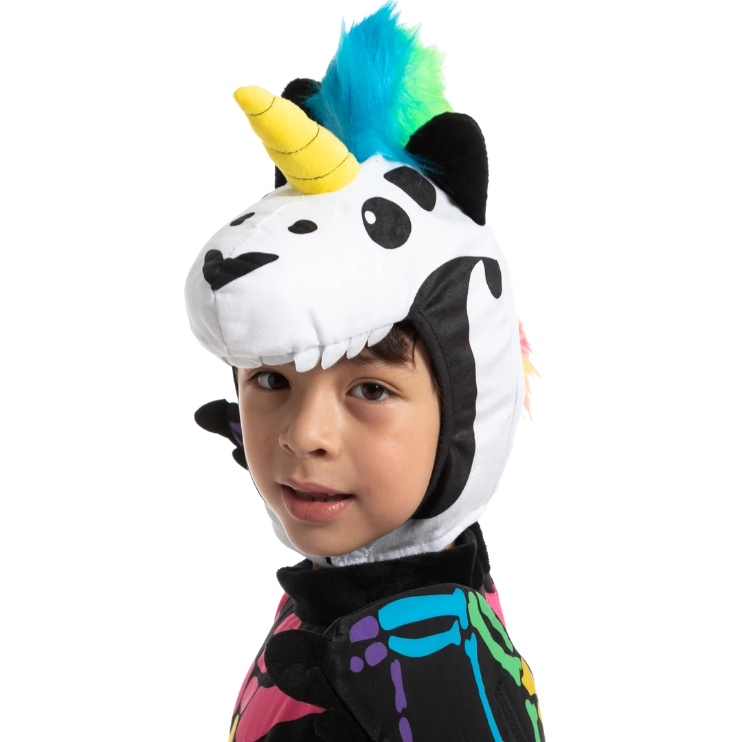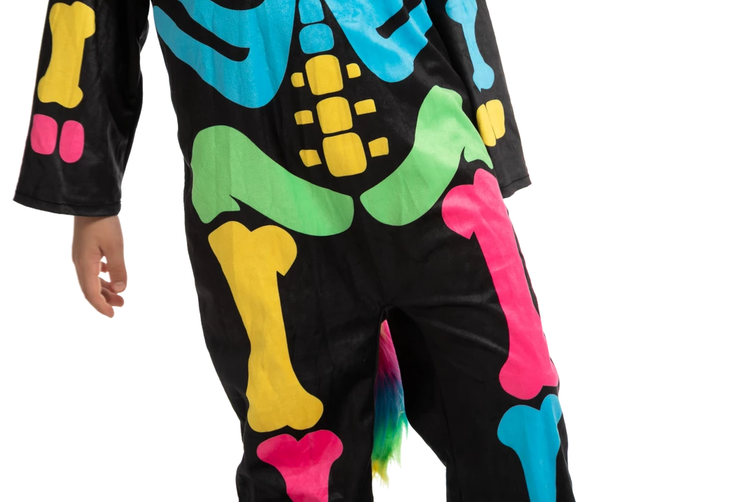 • Comes with a colorful unicorn skeleton jumpsuit costume with attached shoe covers, tail and plush head.