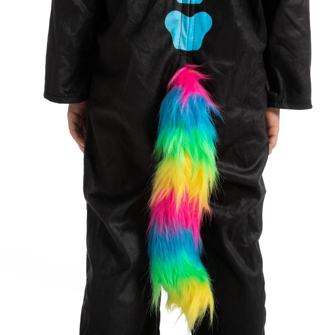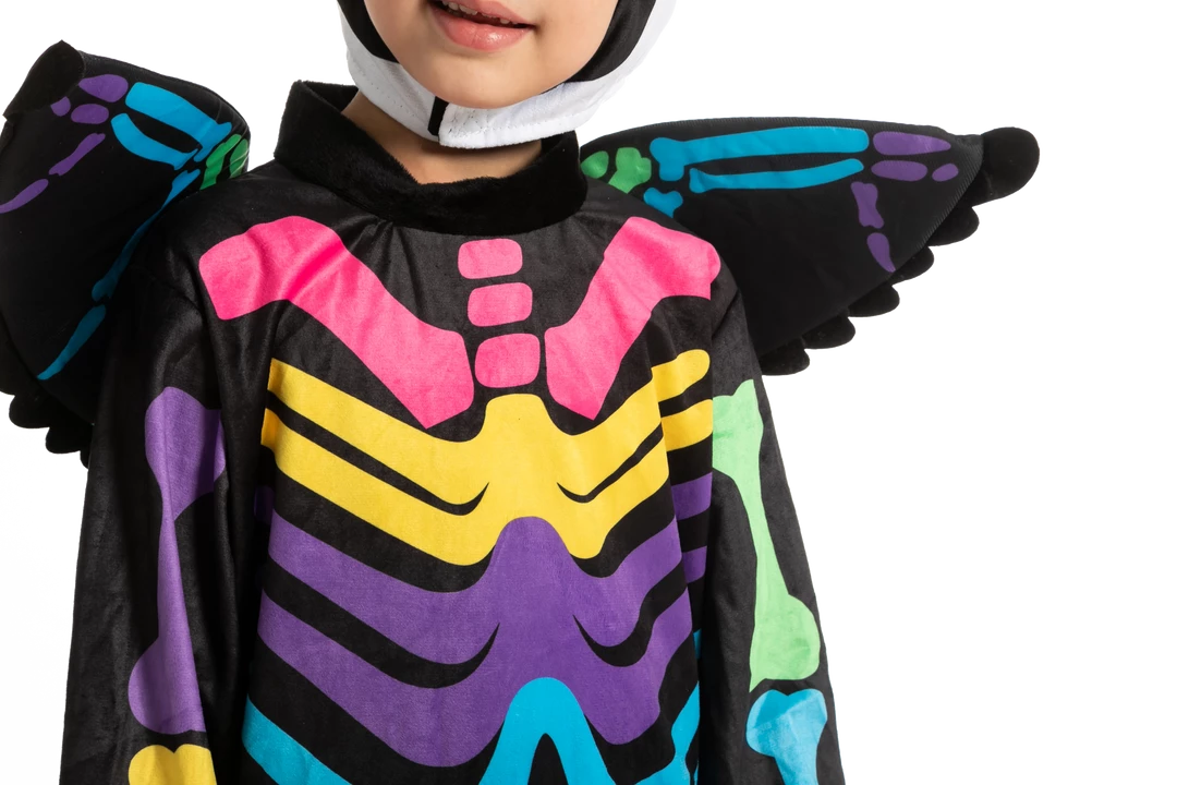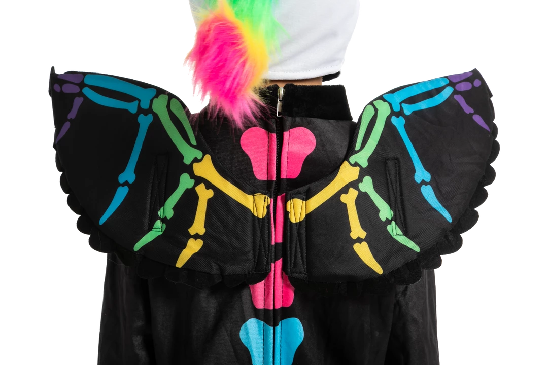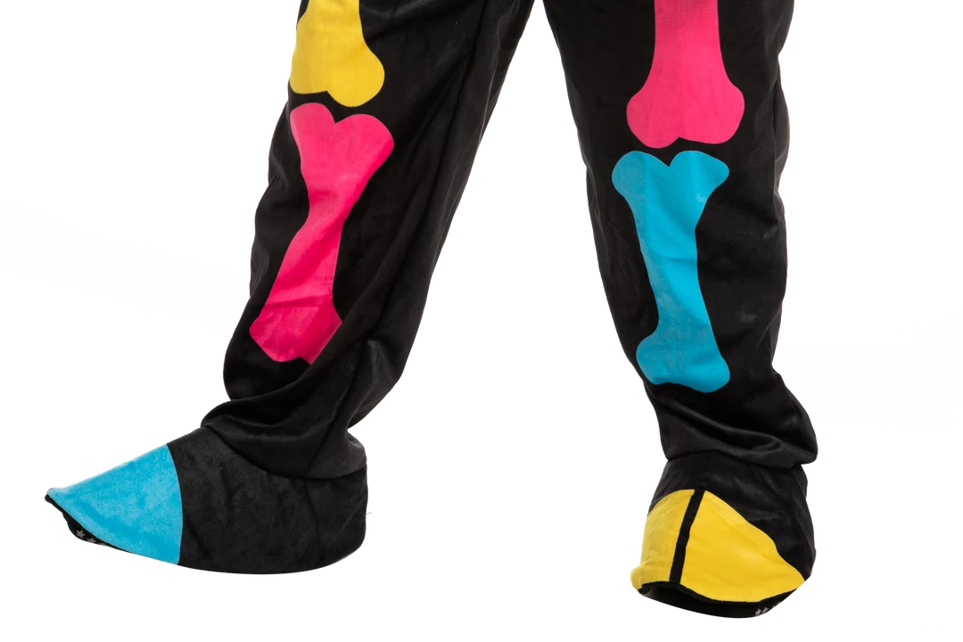 • Comes with a colorful unicorn skeleton jumpsuit costume with attached shoe covers, tail and plush head.