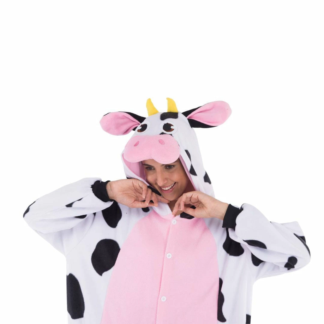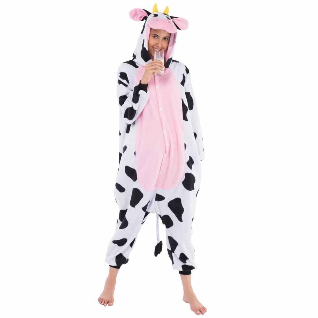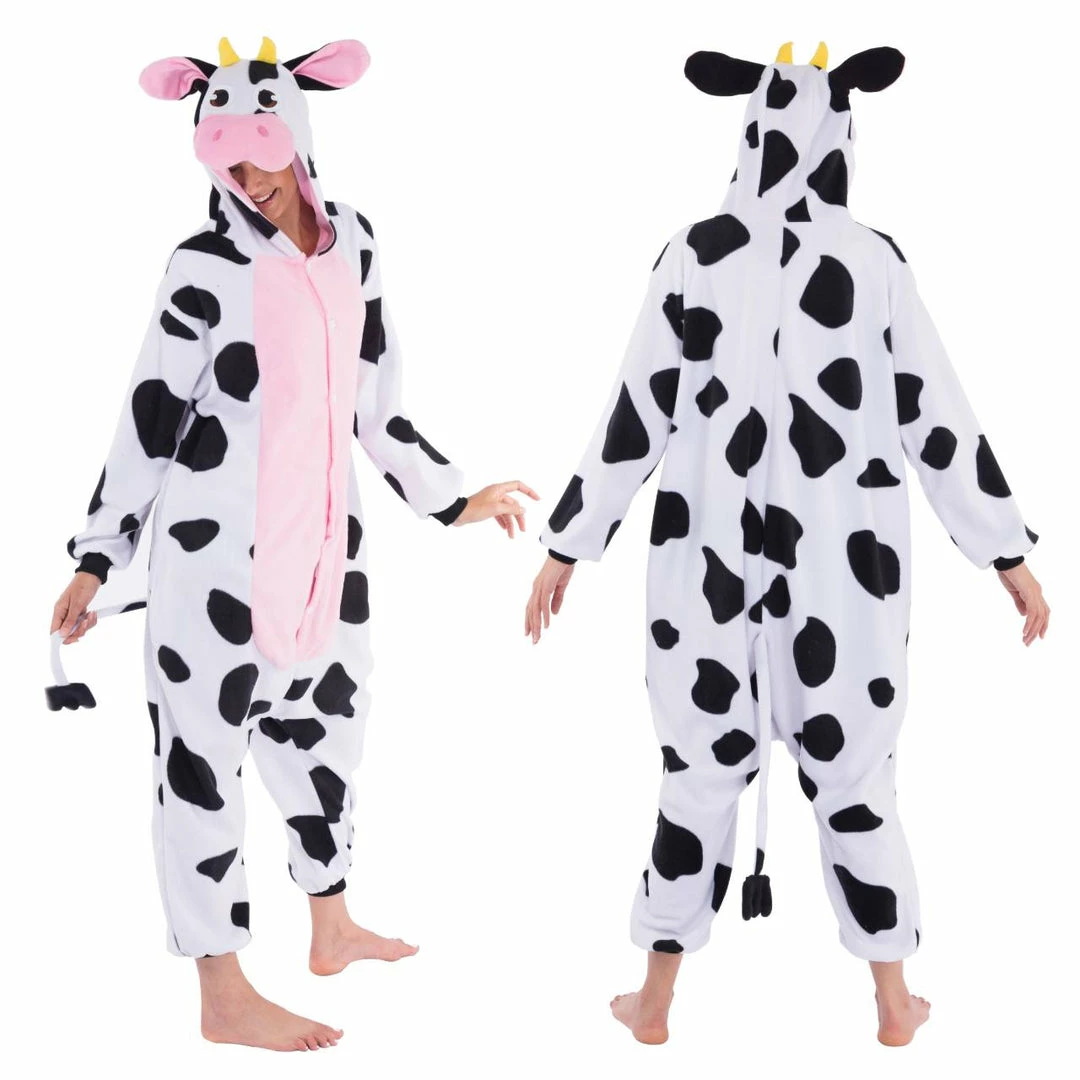 - Deluxe Version of Cow Pajamas One Piece Plush Cosplay Animal Costume Onesie. Adult Size. Made with high-quality plush fleece materials.