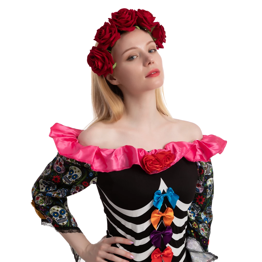 • This Day of the Dead hair garland elastic headband with flowers and face Halloween tattoo set includes an elastic headband and 3pcs face tattoo.