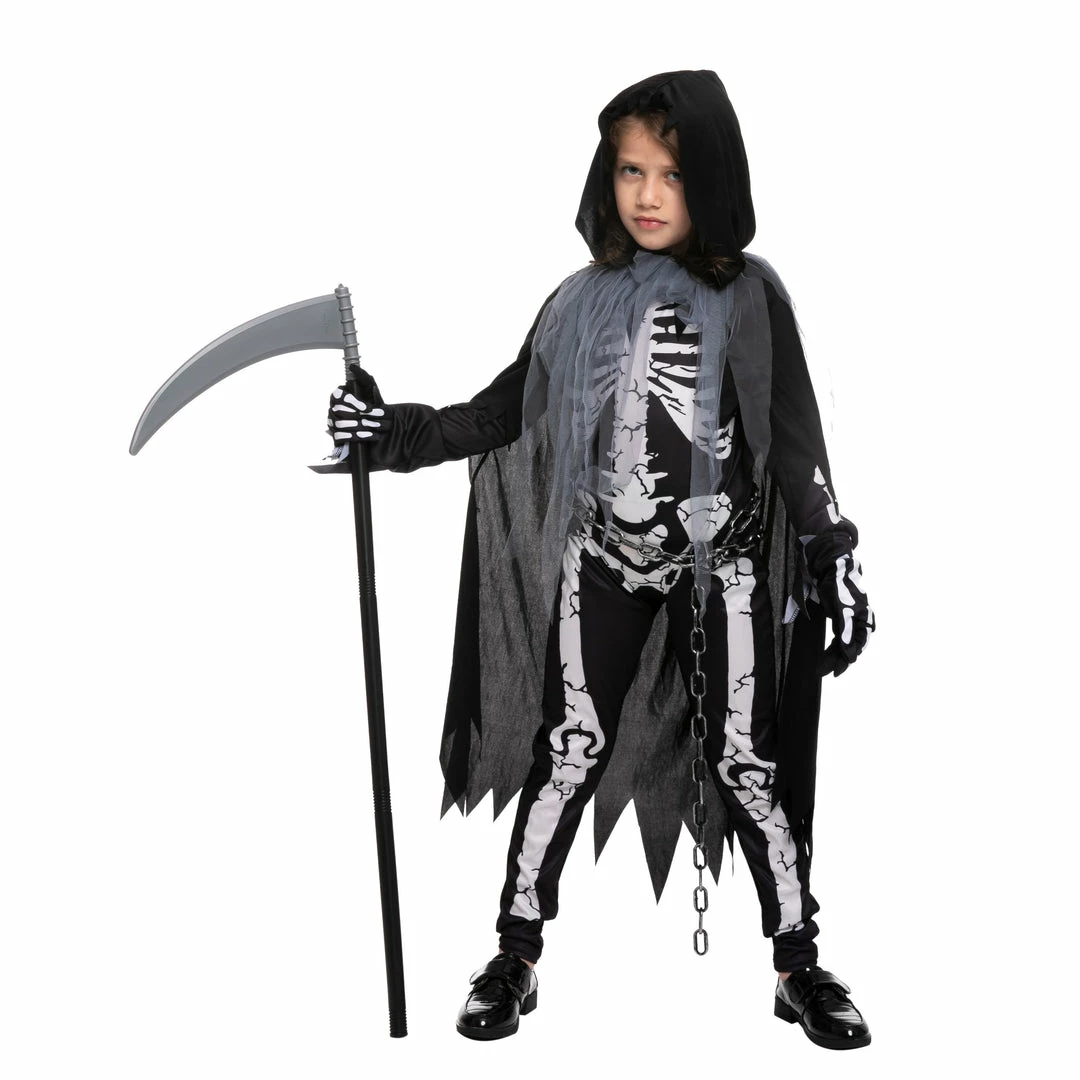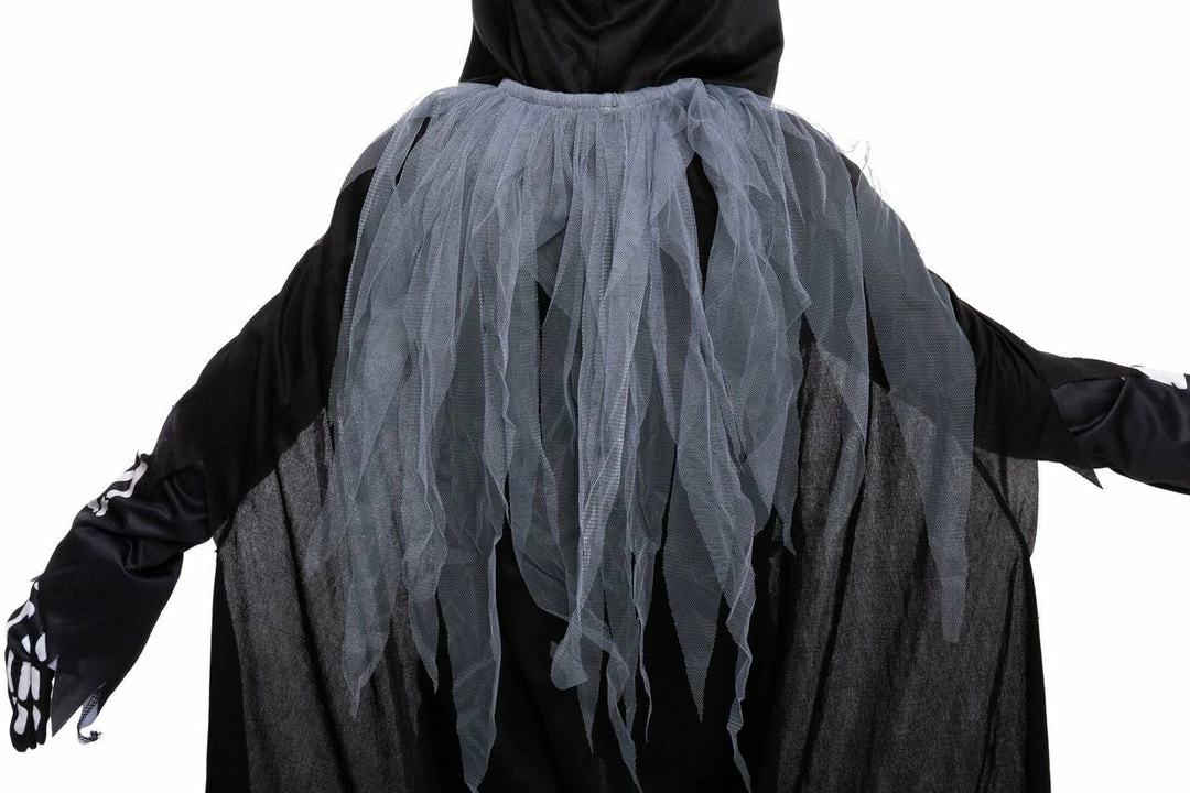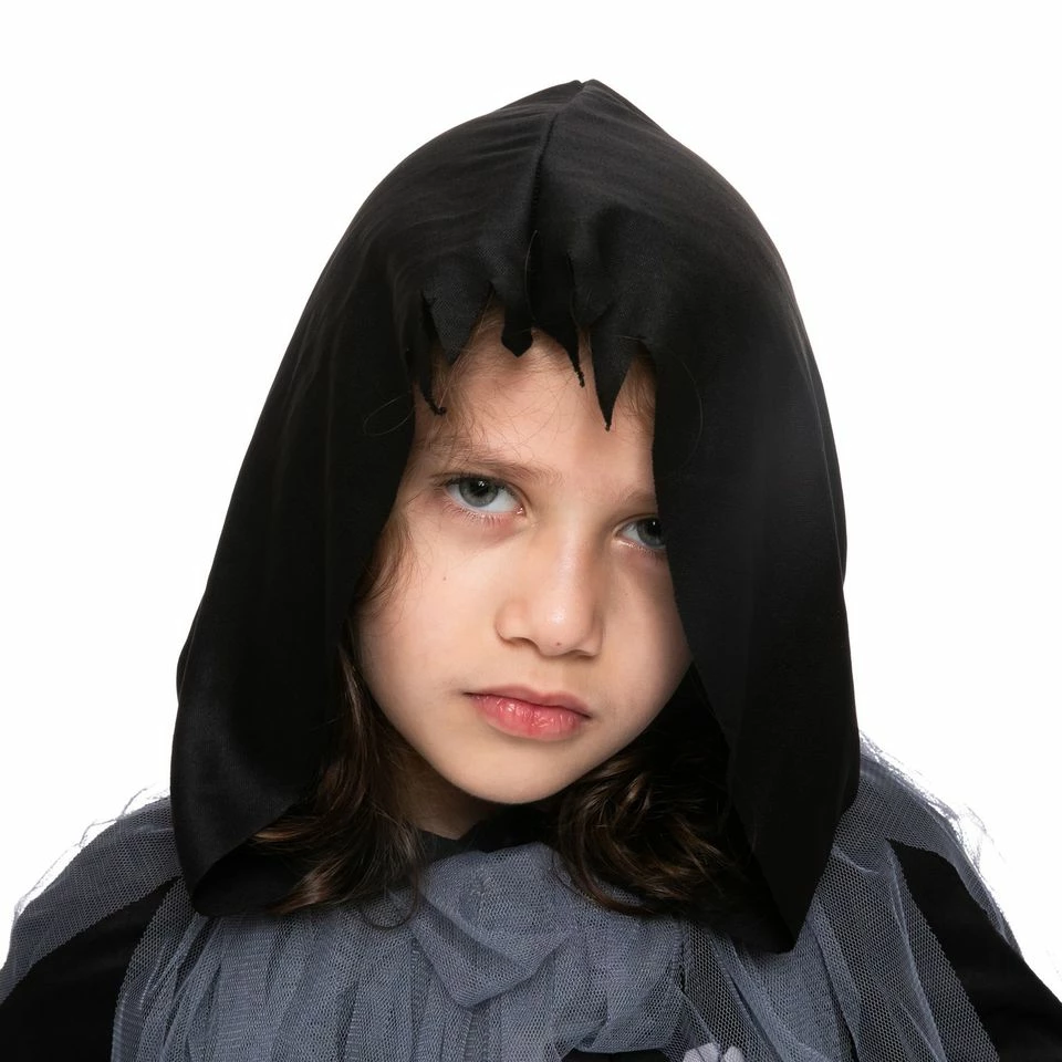 - This reaper costume for girls features a dress & cape pullover hooded cape with a jagged hemline.