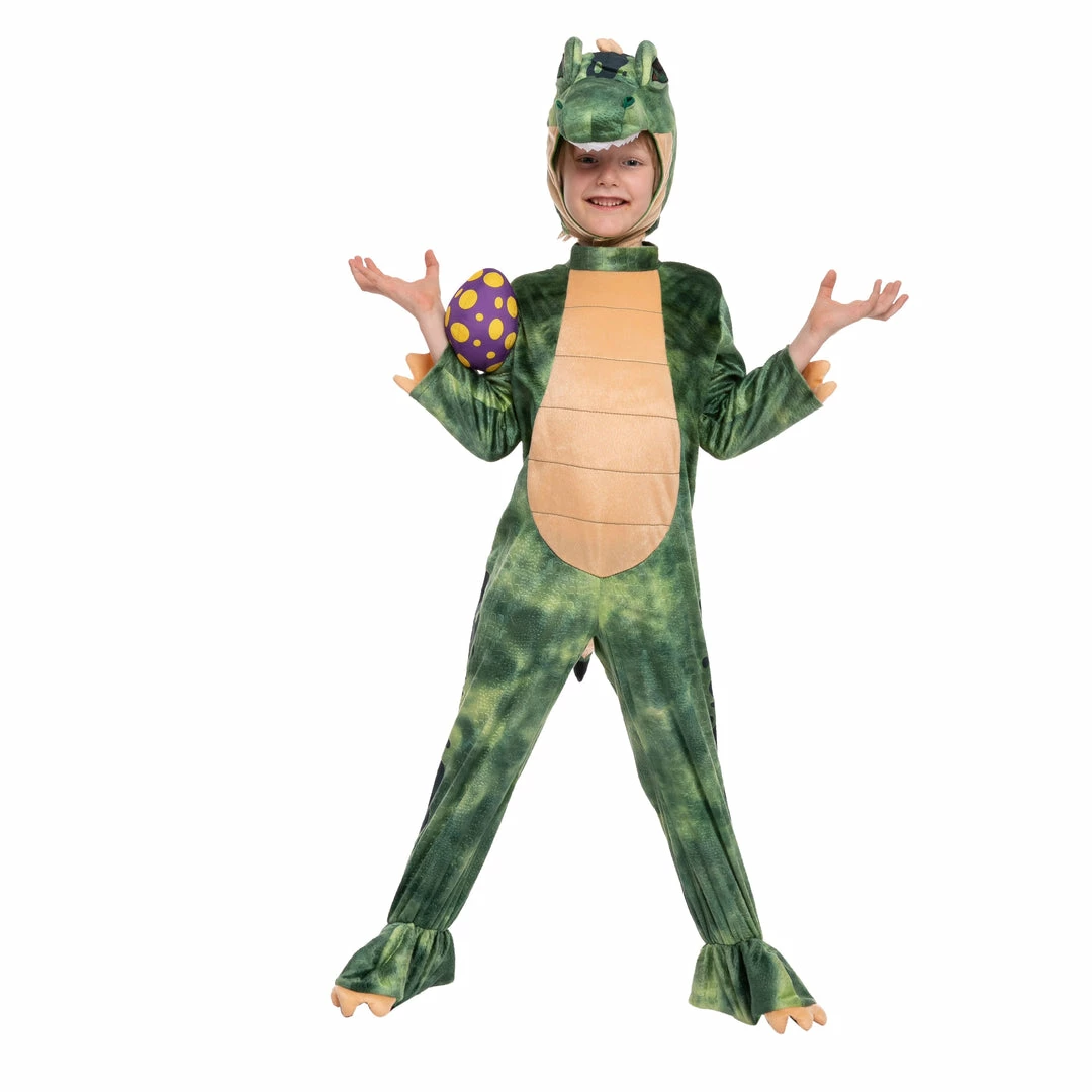 - Our Halloween Costume includes 5 piece set 1 realistic t-rex costume jumpsuit with attached tail and plush head, shoe covers and dinosaur egg.