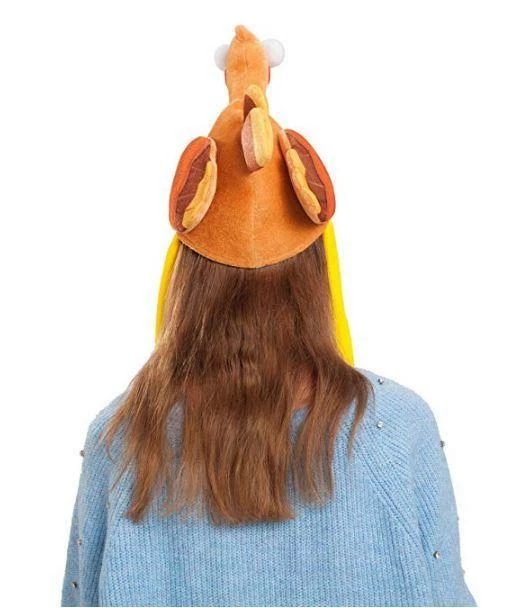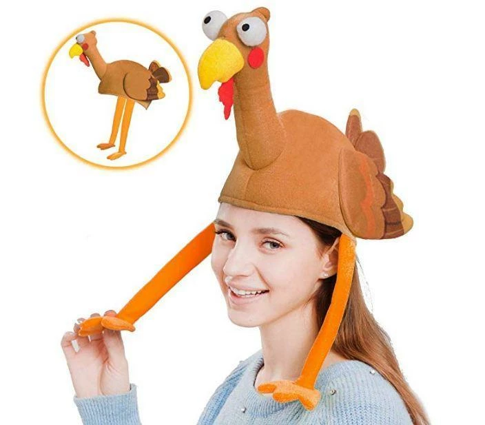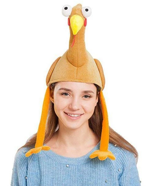 - Funny Thanksgiving Turkey/Gobbler Hat features a plush brown full bodied turkey hat with long yellow legs hanging down and long neck.