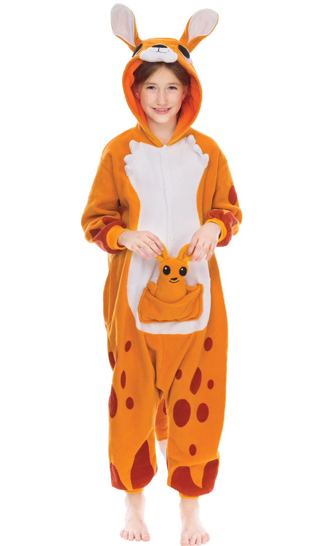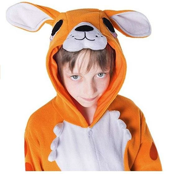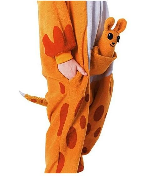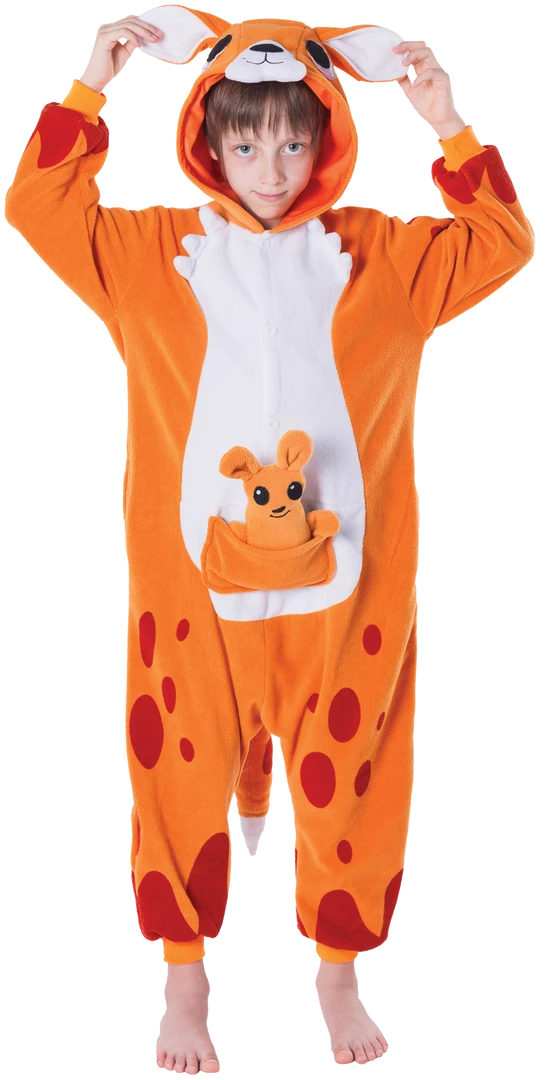 - Deluxe Version of Kangaroo Pajamas One Piece Plush Cosplay Animal Costume Onesie. Child Size. Made with High-Quality Plush Fleece Materials.