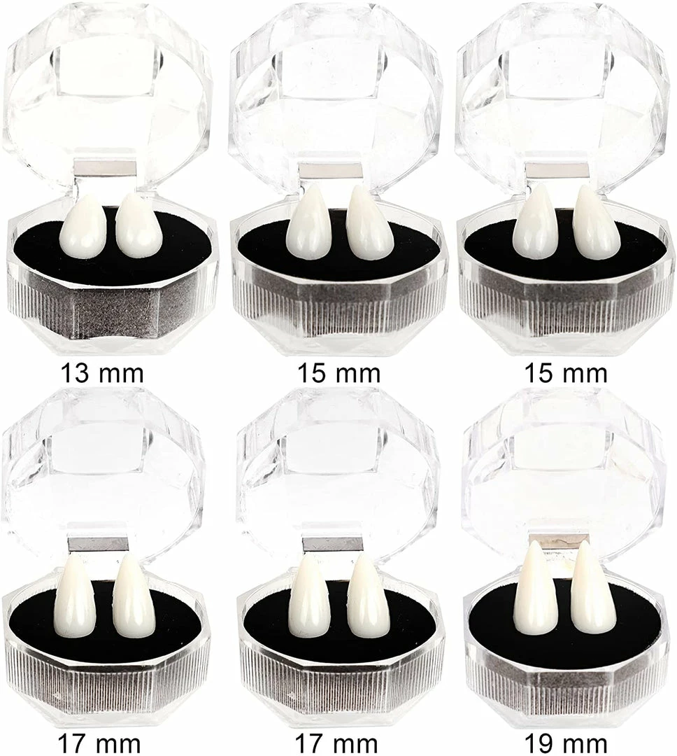 - Real Function. Our Vampire Adhesive Teeth features 4 different sizes specifically 2 13mm, 2 15mm, 2 17mm and 1 19mm. Each pair is contained in a small transparent box.