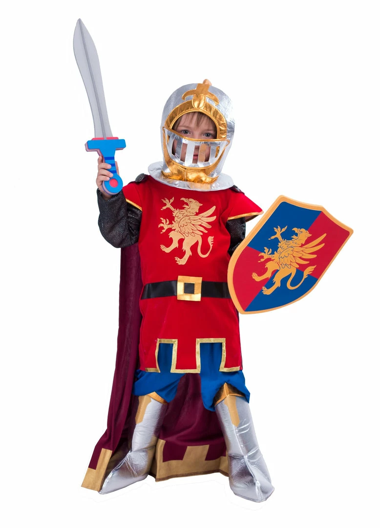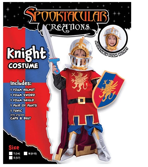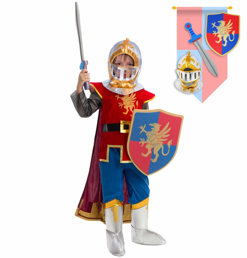 - Renaissance medieval knight costume for boys – kids and toddler, includes foam helmet with adjustable face guard, sword, shield, tunic with attached cape and belt and 1 pair of pants with boot covers!