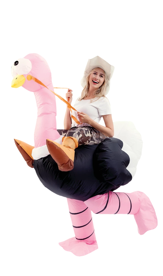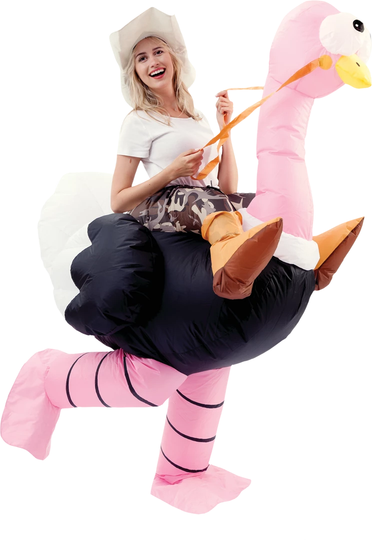 - Includes one Inflatable Ride-On Ostrich Costume, an explorer hat, and an air pump.