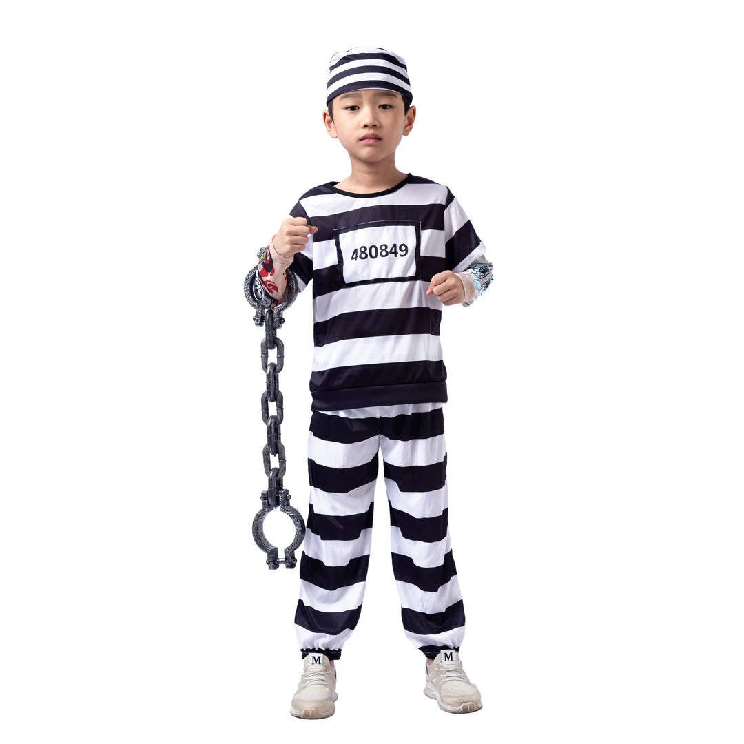 - Role-playing Striped Prison Uniform Halloween Convict Costume Includes Jailbird Hat, Balck, and White Striped Shirt with Attached Tattoo Sleeves, Prison Pants and Toy Handcuffs for Kids.