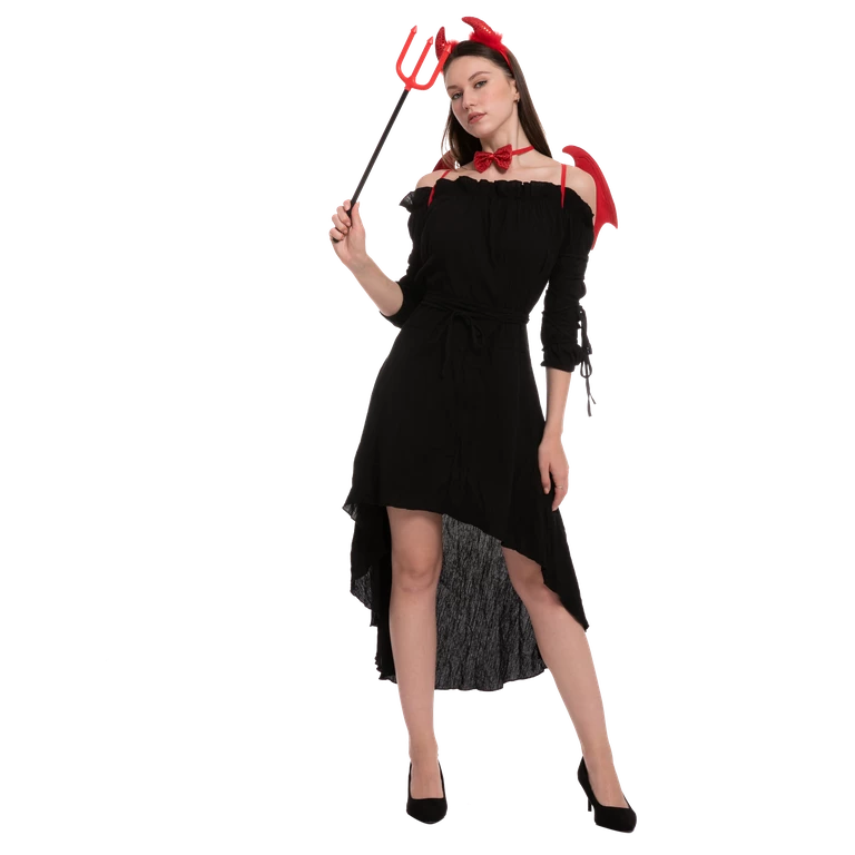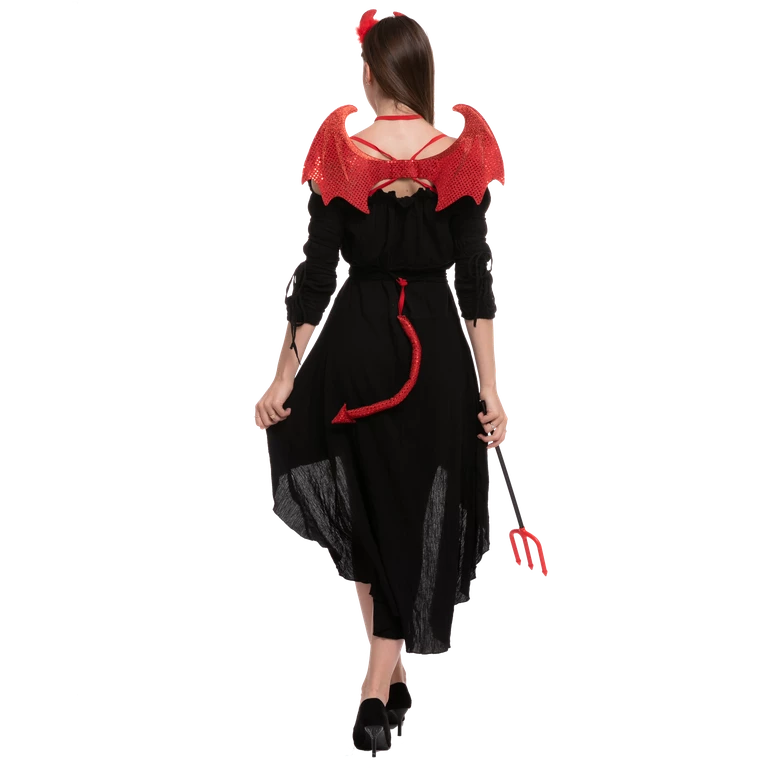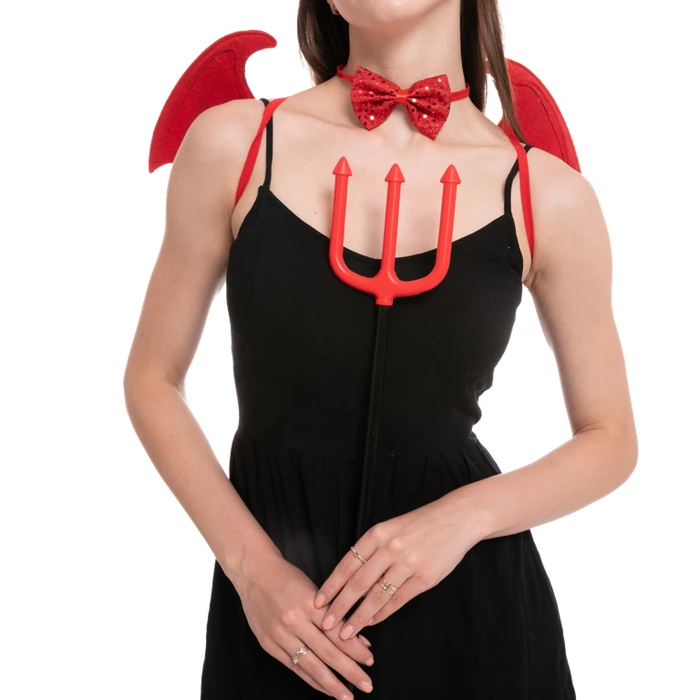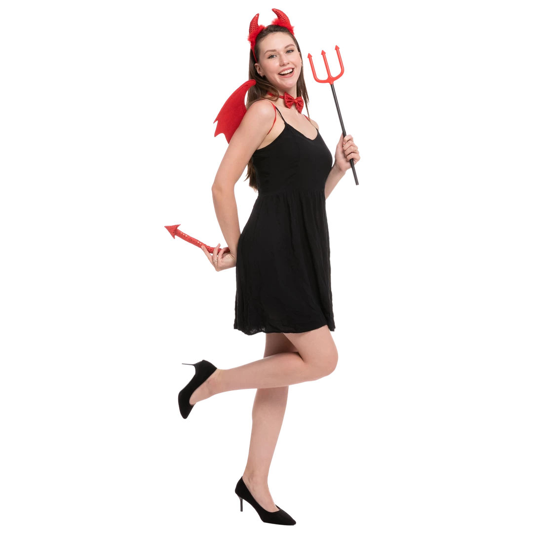 - Includes red 1 devil horn headband, 1 bow tie, 1 tail, 1 trident, 1 pair of devil wings. One size fits all.