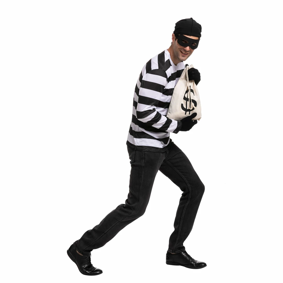 - Includes a money bag, striped long sleeve t-shirt, eye mask, black gloves, 1 black knitted hat that is suitable for adults of all ages.