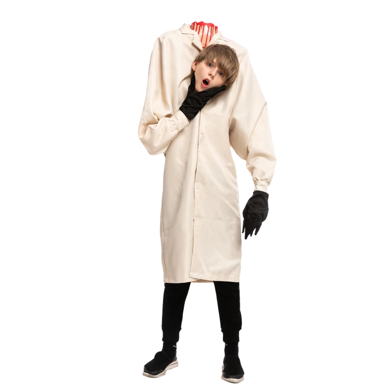- It includes a white shirt, neck headpiece, and an attached severed head.