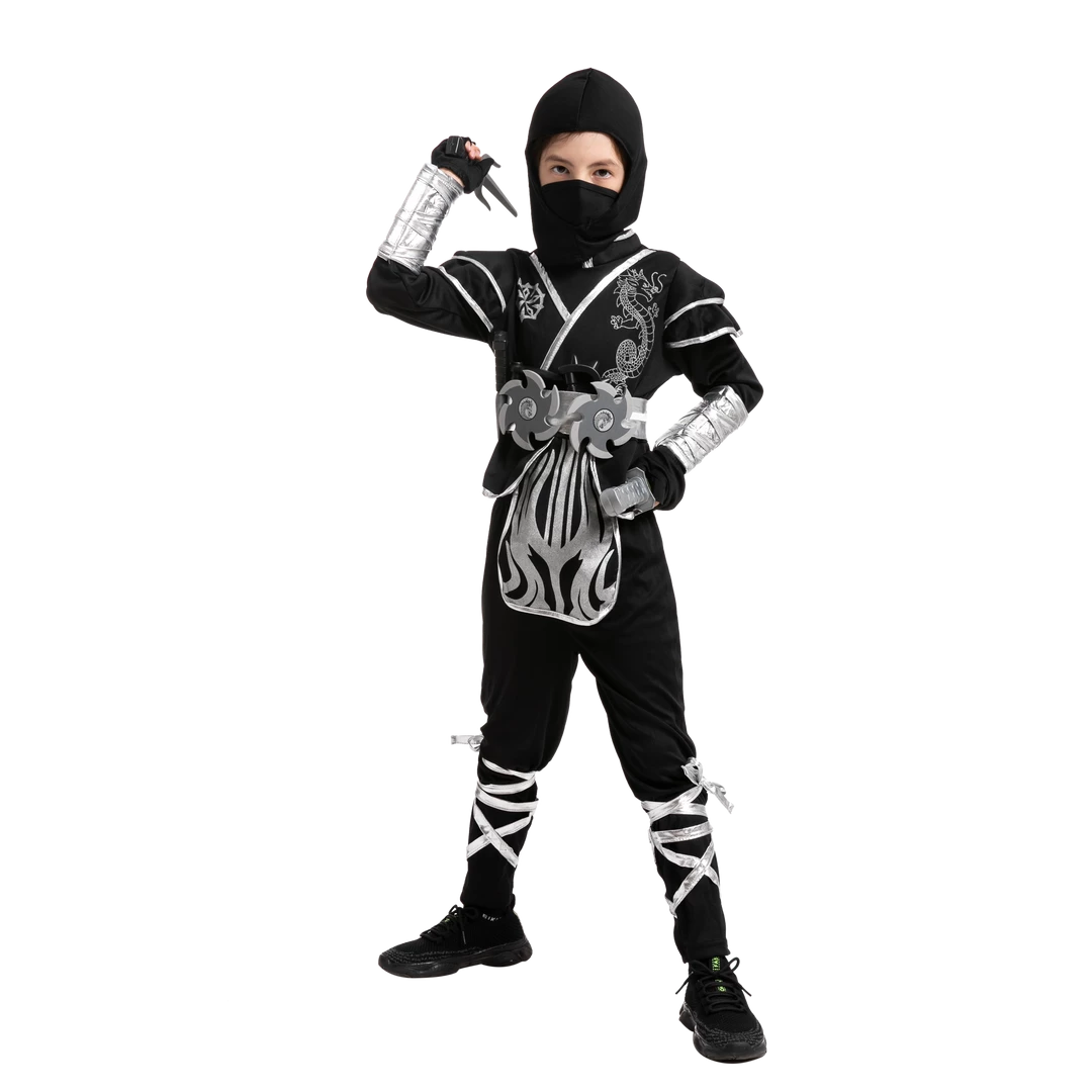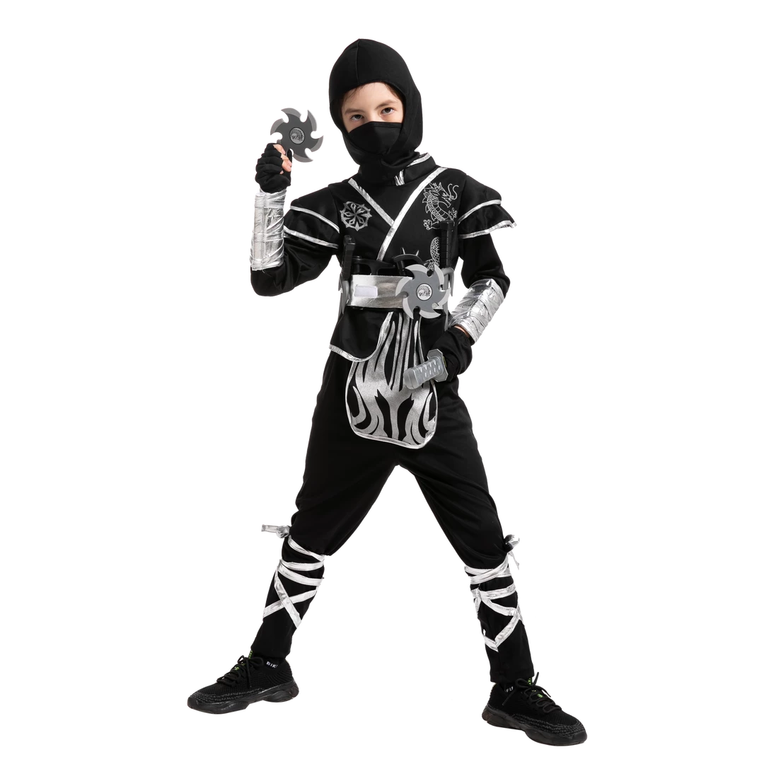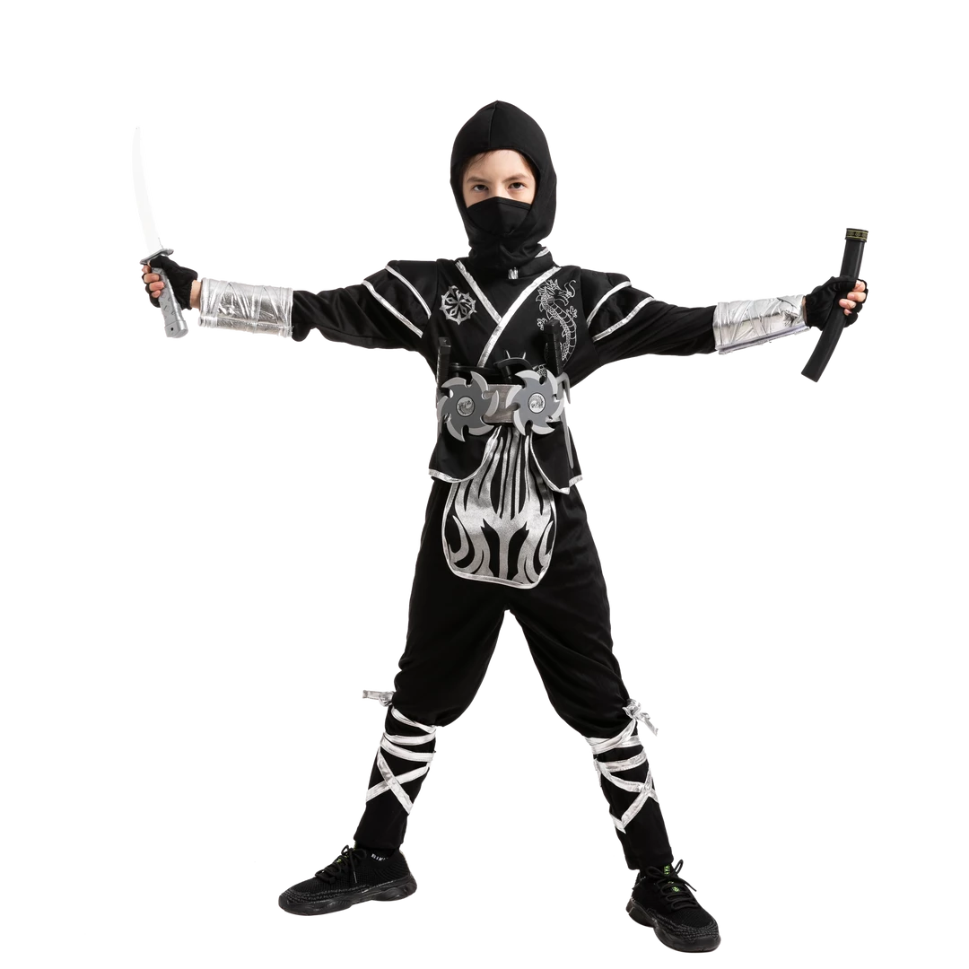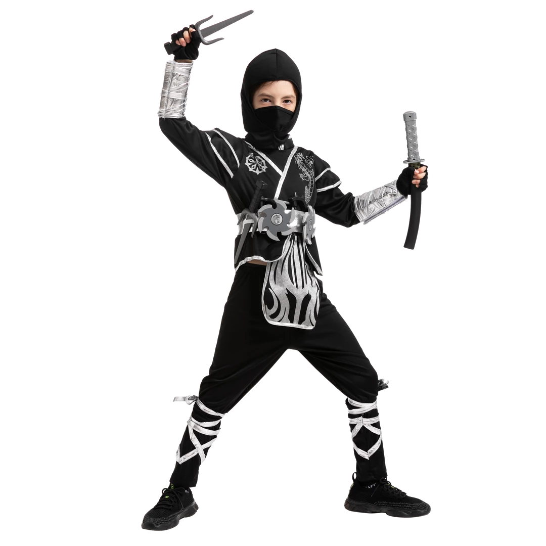 - Ninja Costume for Boys All in One Set. Includes mask, hood, jumpsuit, armor, belt, one pair of gloves, two ninja daggers, two claws, one sword and other foam accessories.
