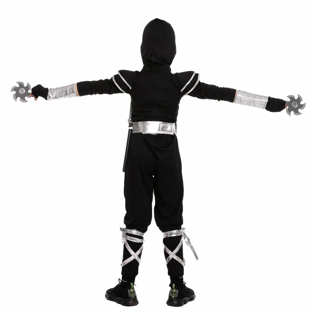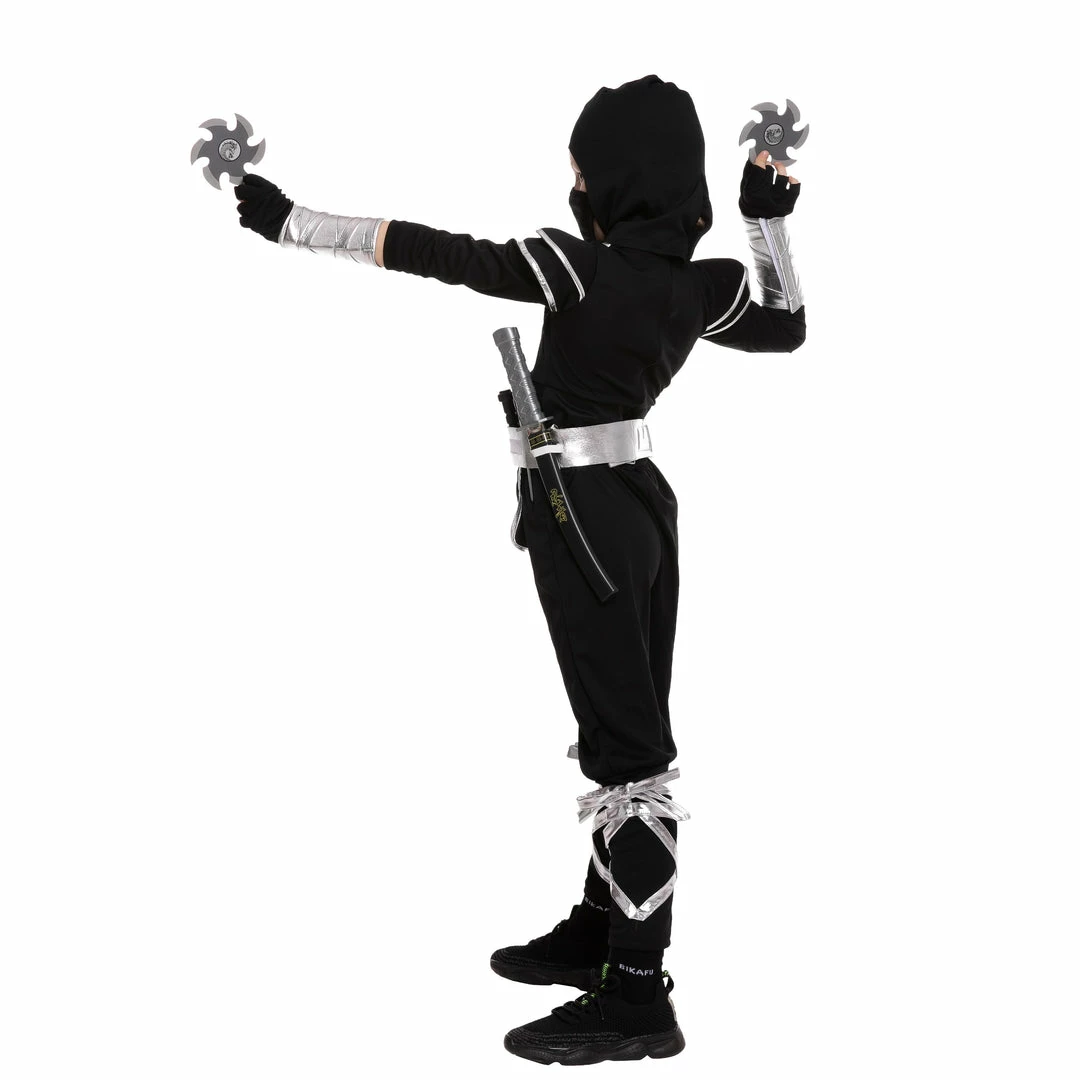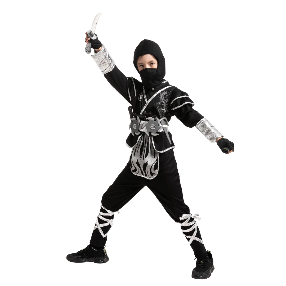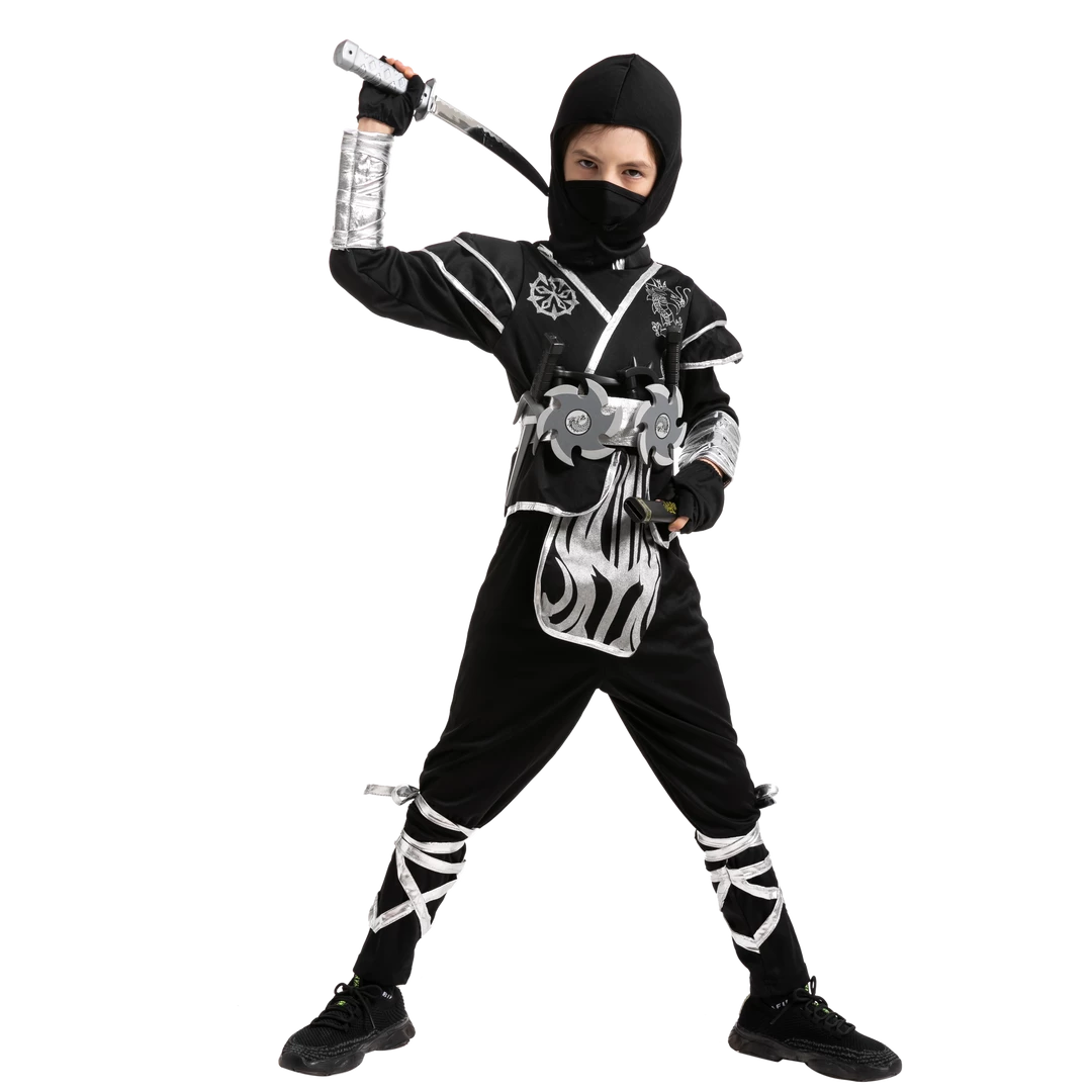 - Ninja Costume for Boys All in One Set. Includes mask, hood, jumpsuit, armor, belt, one pair of gloves, two ninja daggers, two claws, one sword and other foam accessories.