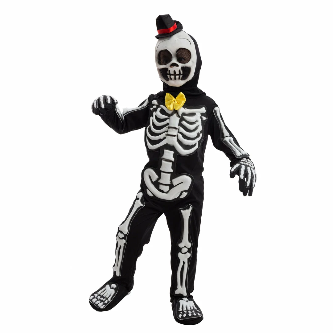 - Unisex Skull Kids Skeleton Costume from Spooktacular Creations includes black skeleton shirt and a mask with EVA bones, 2 gloves, and pants with boot tops.