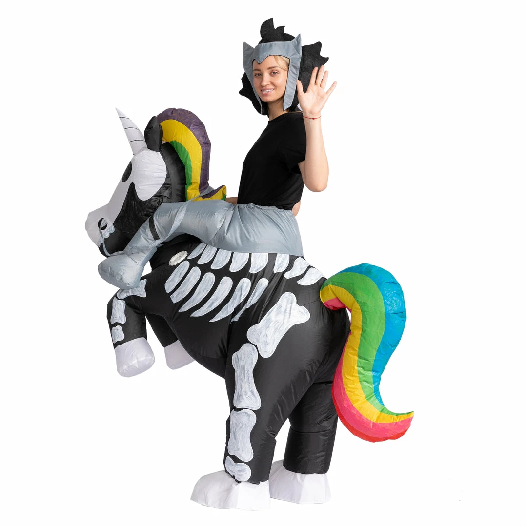 • Ride a Skeleton Unicorn Deluxe Inflatable Ride-on Dress Costume. One size fits all adults. Led lights are built-in.