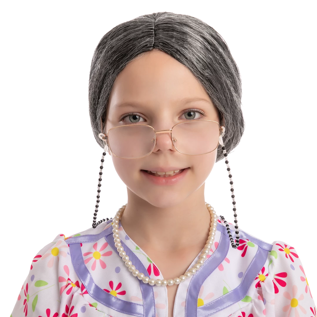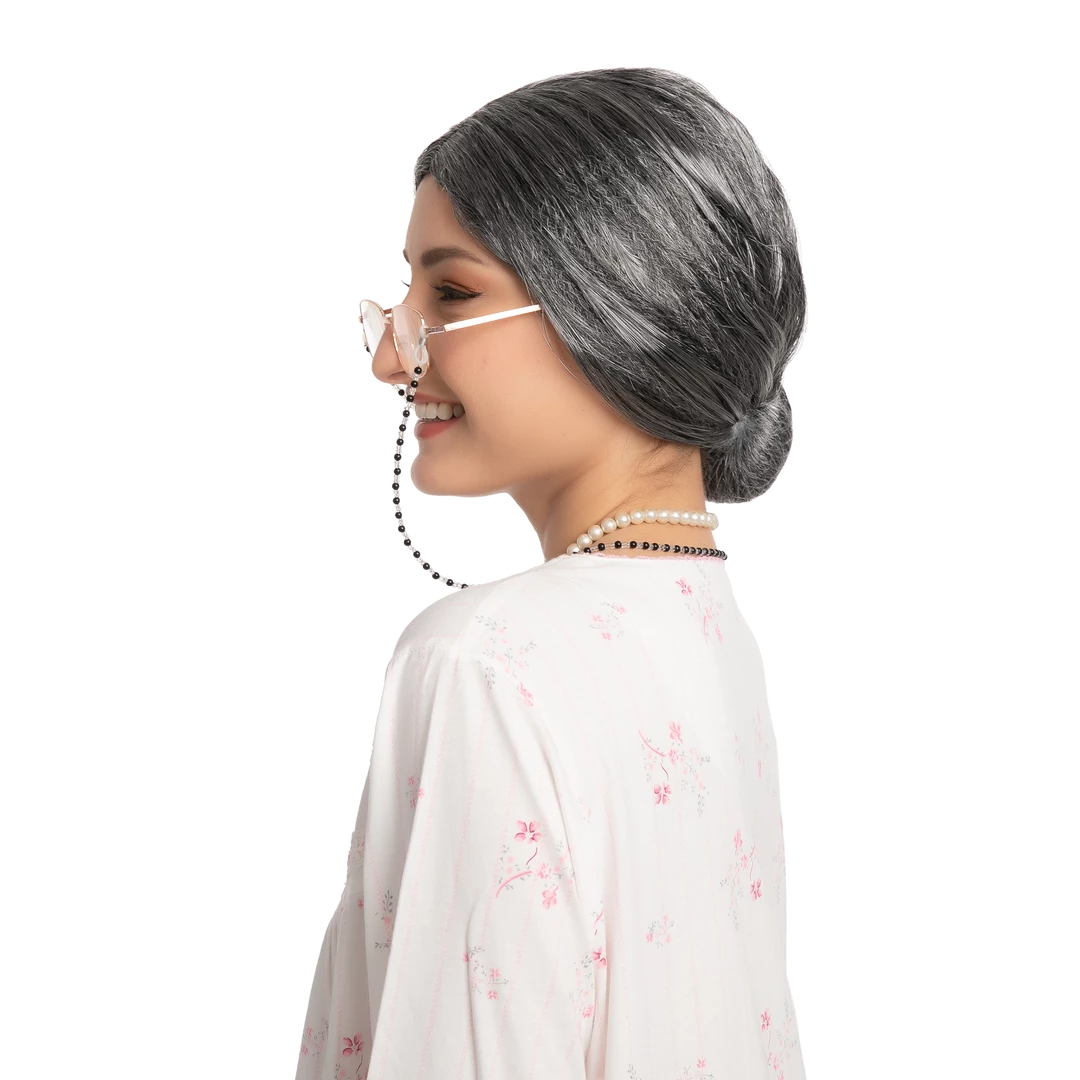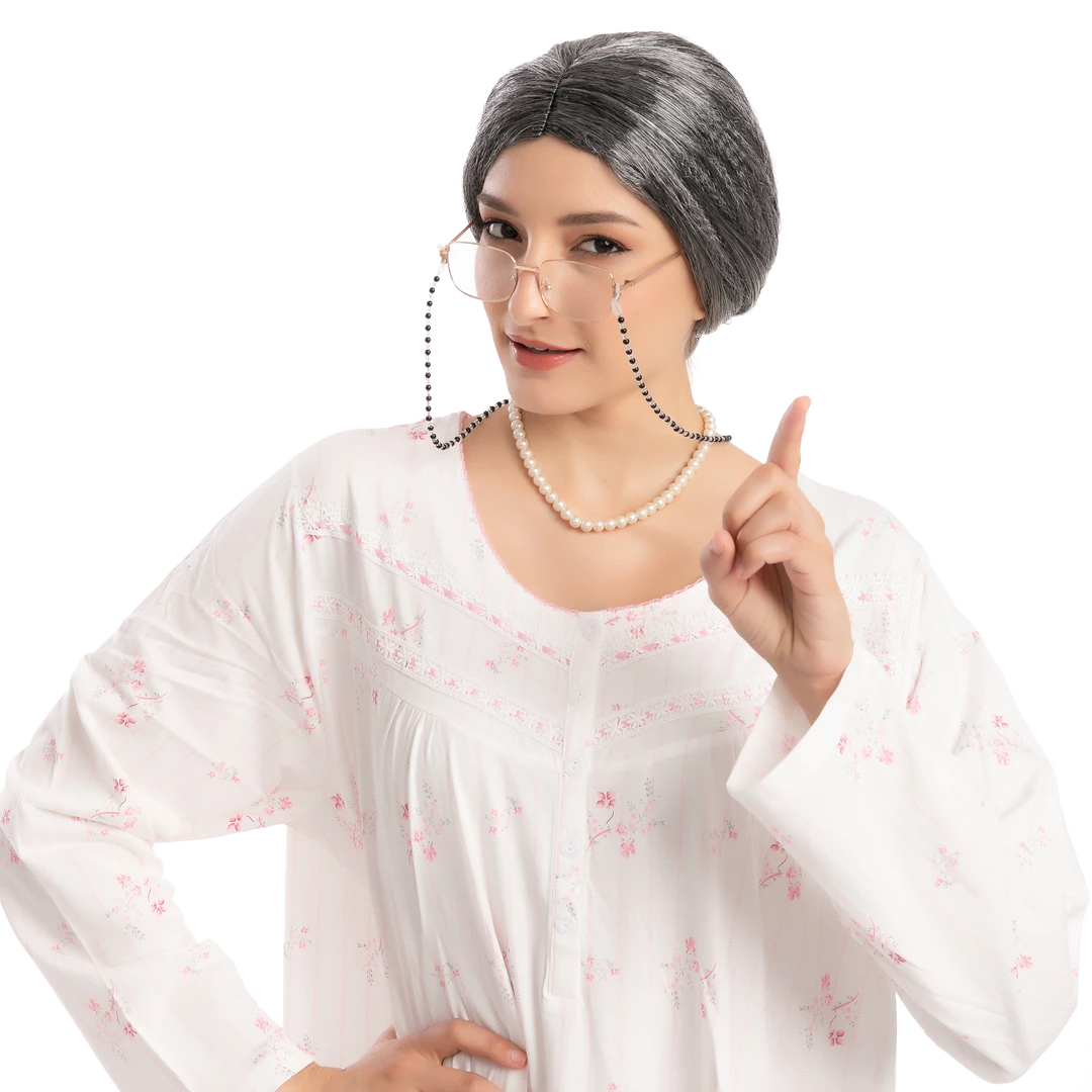 • Super value. This Halloween wig set includes 1 straight silver-grey granny wig, 1 wig cap, 1 pair of glasses, 1 eyeglass chain and 1 pearl necklace.