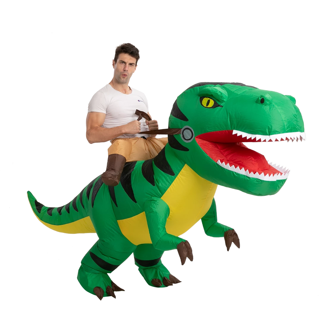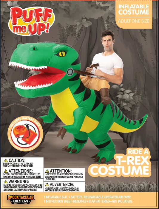 • Includes one T-Rex Ride-On Inflatable Costume, and an air pump.