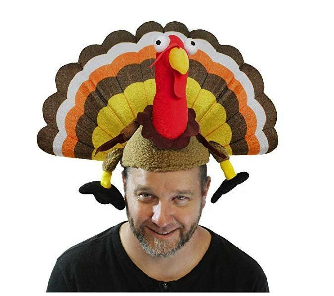- 2 pack funny thanksgiving turkey / gobbler hats features 2 colorful full-bodied turkeys with adjustable embellished turkey tail.