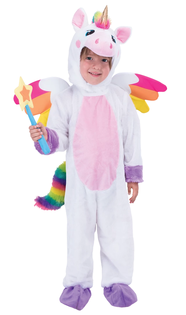 - Unisex kids unicorn costume for girls and boys, includes 1 piece unicorn jumpsuit with attached tail, unicorn hood, a pair of wings and a magic star wand!