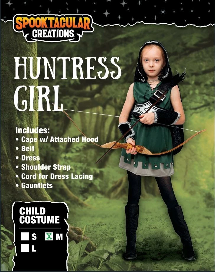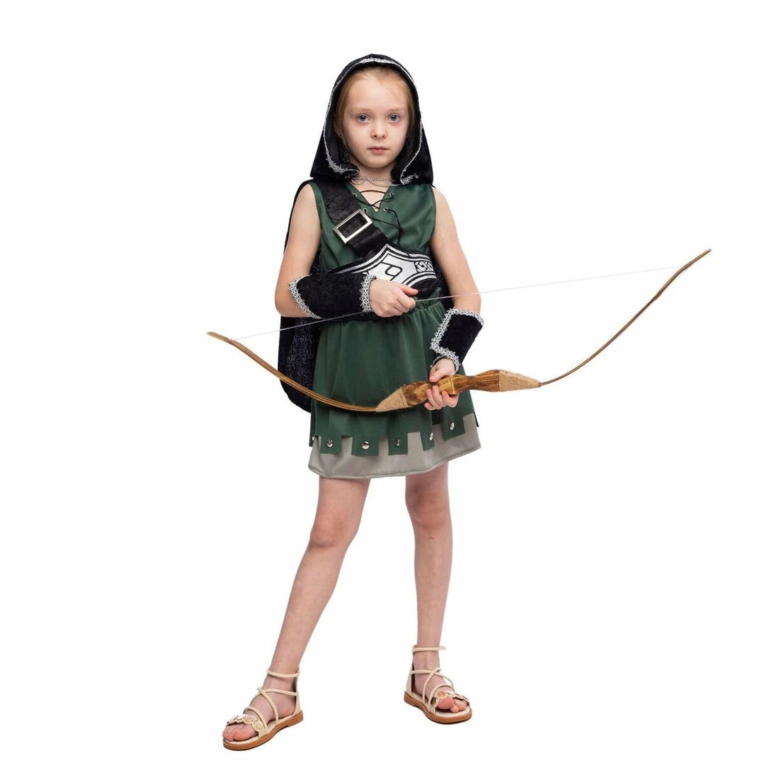 - Girl Robin Hood Costume includes Huntress Cape with Attached Hood, Tunic Dress with Lace-up Front, Printed Waist Belt, Shoulder Strap, Cord for Dress Lacing and Gauntlets. Bow and Arrow are NOT included.